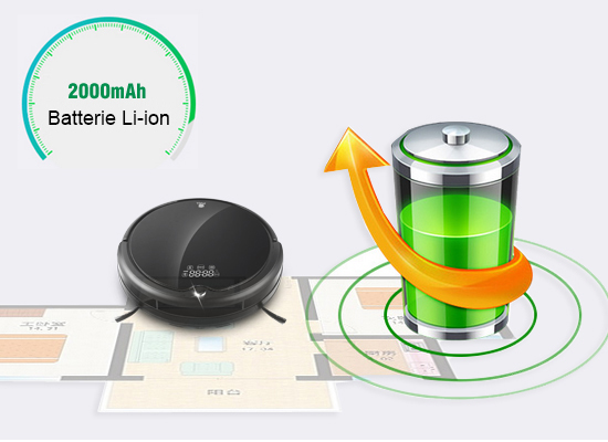 La batterie Li-ion 2000 mAh dure longtemps et consomme peu d'énergie. Le nettoyage ponctuel peut couvrir une superficie de 150-200 ㎡ en 100 minutes.