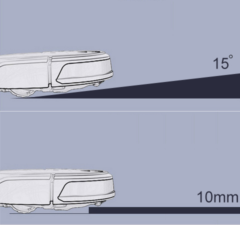 Le robot peut grimper sur une pente allant jusqu'à 15 degrés d'angle et une hauteur jusqu'à 10 mm.